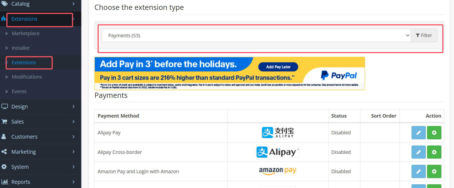 登錄 OpenCart 后臺,進(jìn)入 “擴展> 擴展 > 支付方式”,找到 “我的支付插件”,點擊 “安裝”,然后點擊 “編輯” 配置訂單狀態(tài)等參數(shù),最后啟用插件。